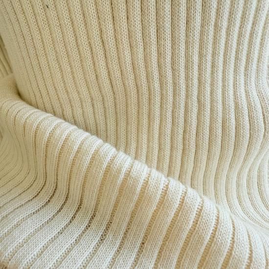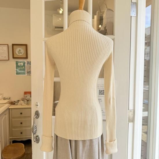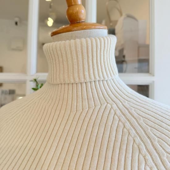 最上級のカシミヤ糸と、細番手のオーガニックコットンをひきそろえて編んだ無縫製のリブタートルセーター