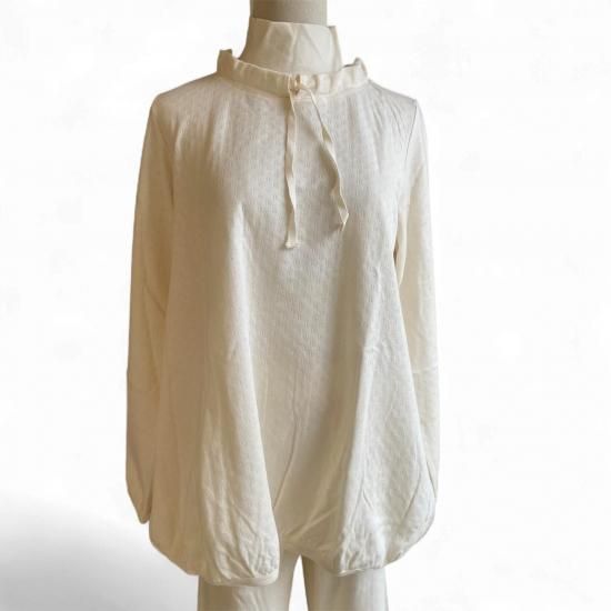 首元はやわらかなフライスのタートルであたたかく、衿のリボンをしぼればよりあたたかくなります。