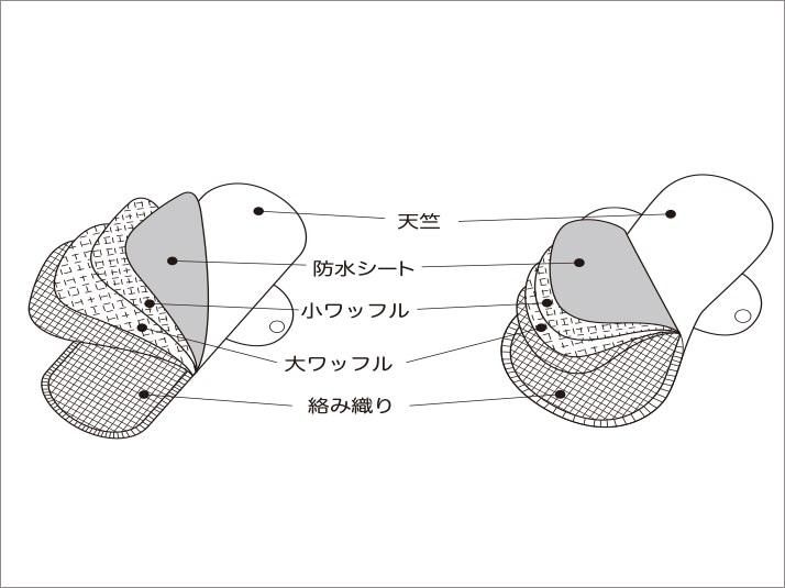 さらさらメッシュの肌側のからみ織り面と、裏側のなめらかな天竺面、そして吸水性に優れた大小織り柄の凹凸の違うワッフル地を中に2枚入れ、 さらに防水シートが入っています。