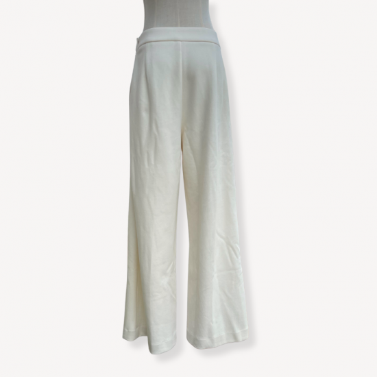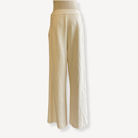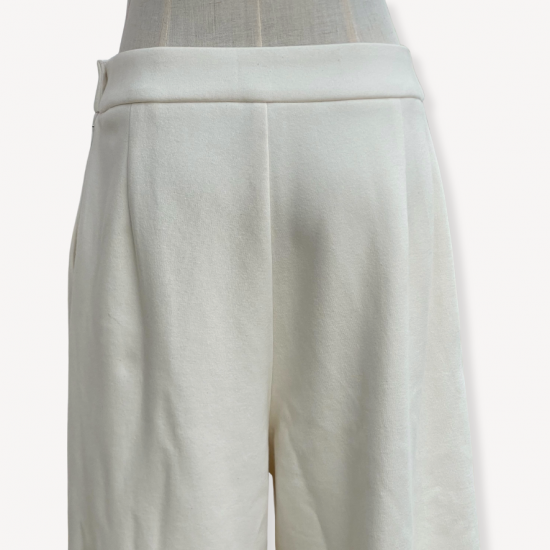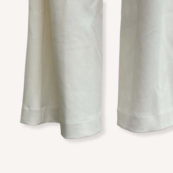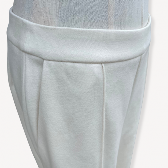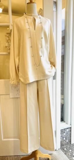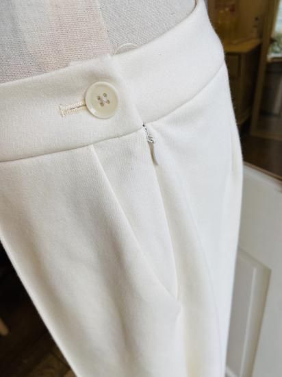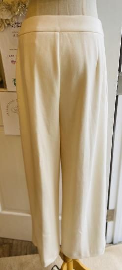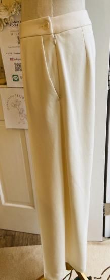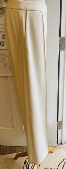 太めのストレートシルエットにセンタープレスを入れているかの様なピンタックがポイント。 これまでのプリスティンのパンツよりもやや長めの丈にしています。