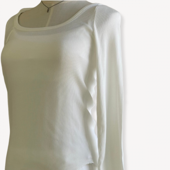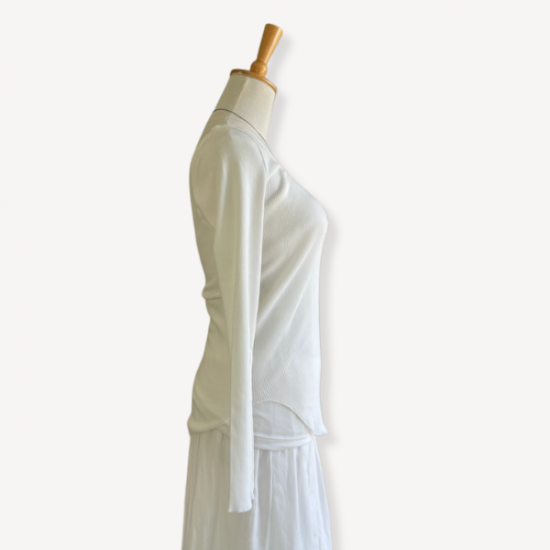 インナーとして着やすい広めの衿ぐりで、若干スクエアに寄せたUネックラインや透けた時に見えるラインにもニュアンスが出るようデザインしています。 ボトムスにインした際にもたつきが出にくいよう裾はすっきりとしたラウンド型。軽さを出しつつもラフになりすぎない、袖口と裾の糸始末にもこだわりました。