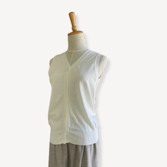 強撚糸を編み立てたさらりとした着心地のノースリーブニット。 前後両用で着用できて、たくさん着まわせるアイテムです。片面はクルーネック、もう片面はベストとしても使える浅めのVネックのボタン開きのデザインです。