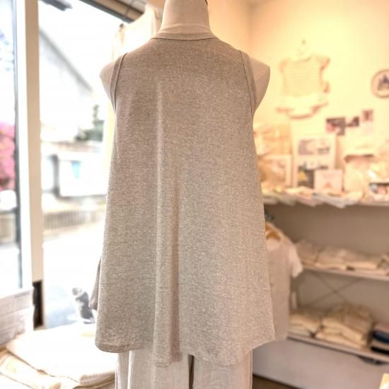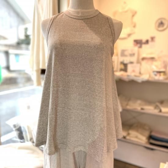 スッキリとしたノースリーブのデザインながら、着丈は前後差を付けて、後ろ身頃にはたっぷりフレアを入れています。動くたびにドレープ感に飛んだフレアが軽やかに揺れます。