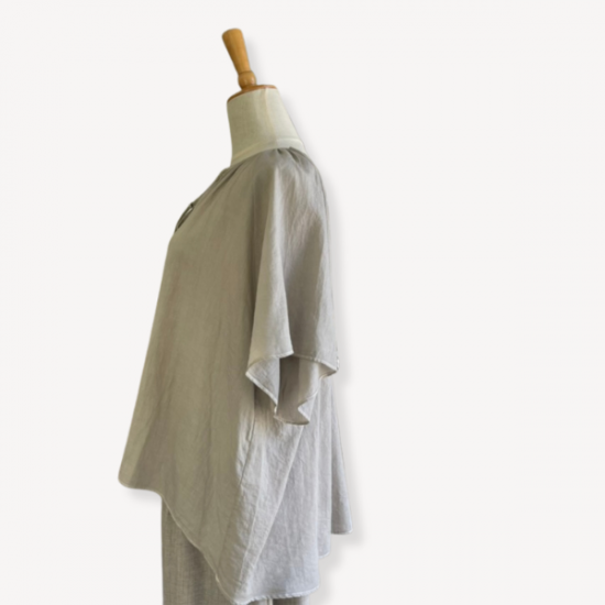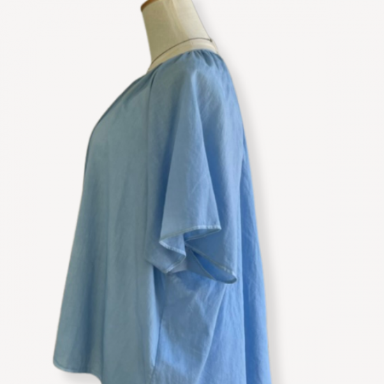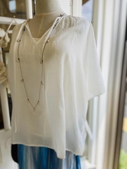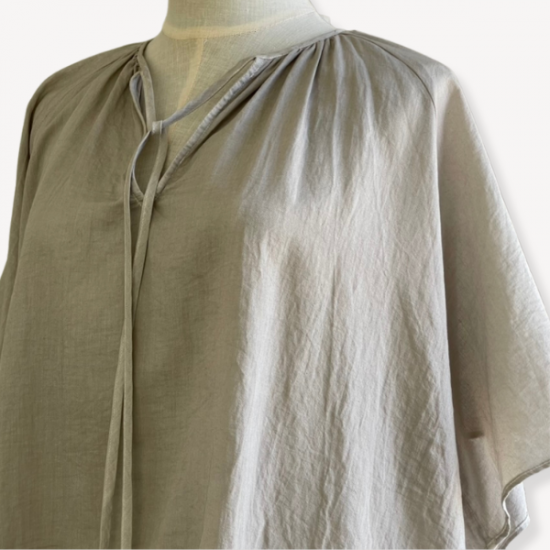 まるで大空を舞うトンボの羽のような、美しい透け感が魅力のカルゼ生地。細番手の糸を使用し、ゆっくりゆっくり綾織りで仕上げた素材は、独特の光沢が生まれ高級感があります。ふんわり薄くて柔らかなブラウスです。