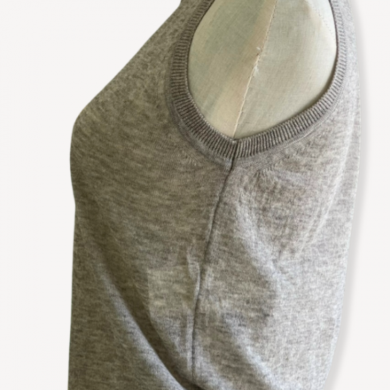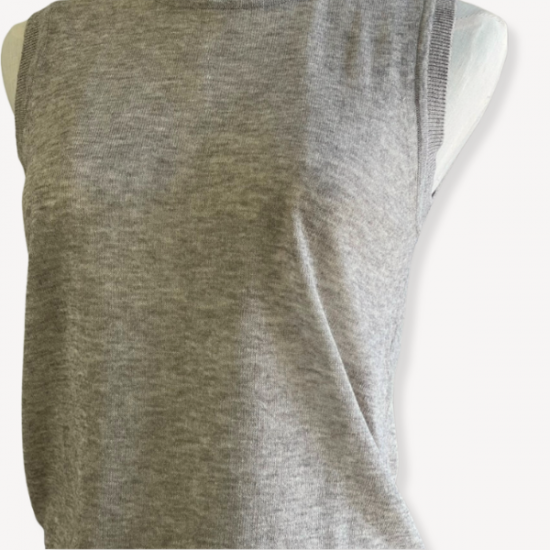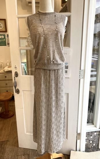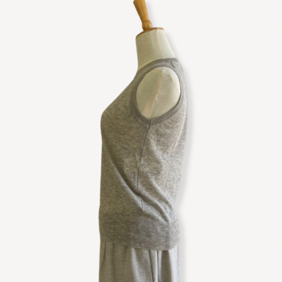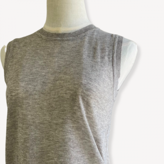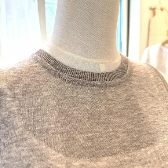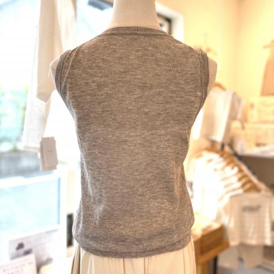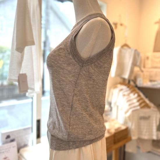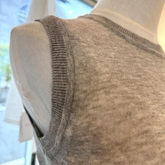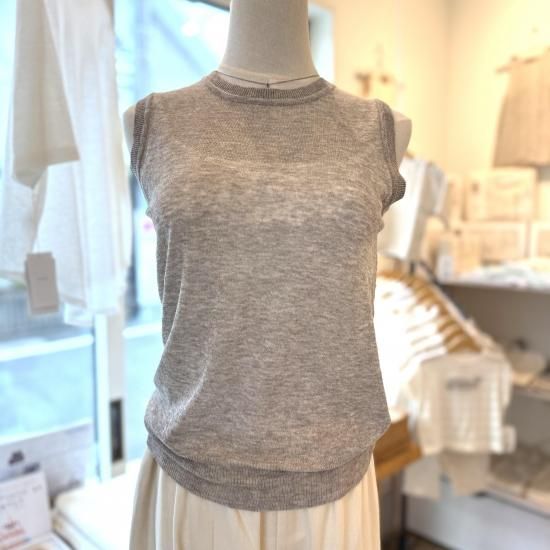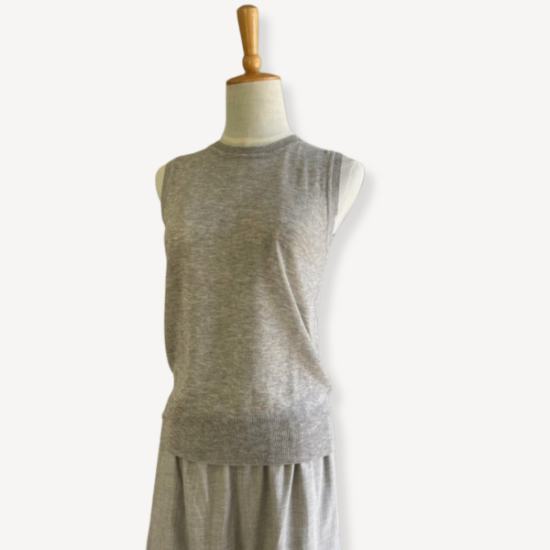 サラリとした肌触りが特徴のヤク混紡糸、「爽」を使用したクルーネックのノースリーブプルオーバー。 薄手のガーゼのような軽やかなタッチで肌離れが良く、心地よい着用感が魅力。