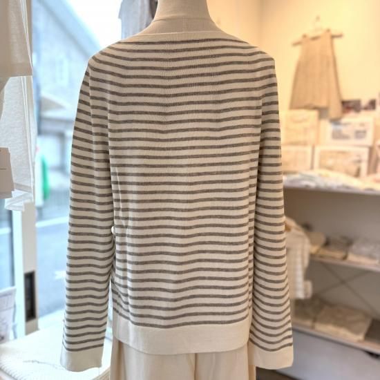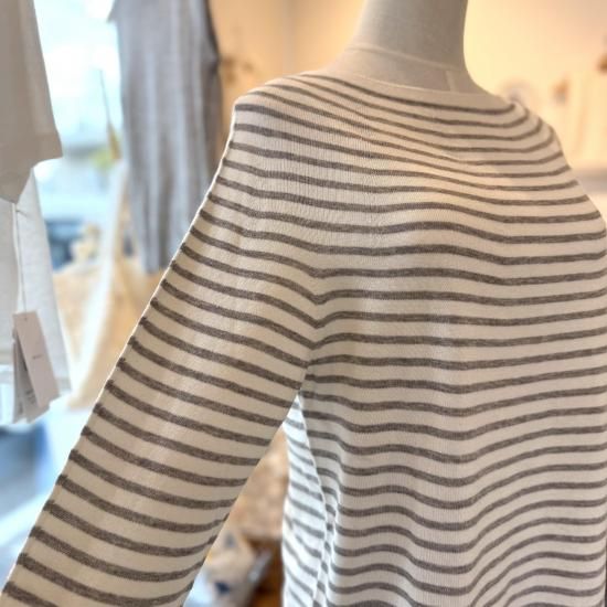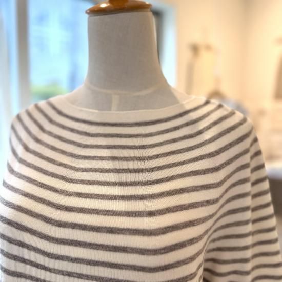 やわらかなグレーのボーダーは品の良い大人のスタイルを演出。衿周りが求心編みで衿ぐりに沿ってボーダーが入っているためカジュアルになりすぎず、また肩幅も気にせず上品な着こなしが楽しめます。