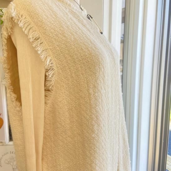 華やぐツイードのベストコットンとウールの様々な種類の糸を使用した、オリジナルのツイード生地のベスト。表情豊かな糸使いを活かしたフリンジデザインで、シンプルながら華やかなアイテムです。