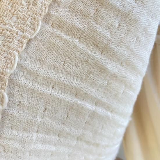着心地も表情も贅沢なプリスティンならではの素材贅沢な糸使いと、職人の匠の技と知識を駆使して仕上がった特別な素材です。表側のツイードは太番手のコットン2種類、ランダムにスラブのあるウール糸、ループのあるモヘヤ糸と多種多様な5種類の糸を交互に織り合わせています。裏側はコットン100% のガーゼで肌あたりにもこだわった二重織です。