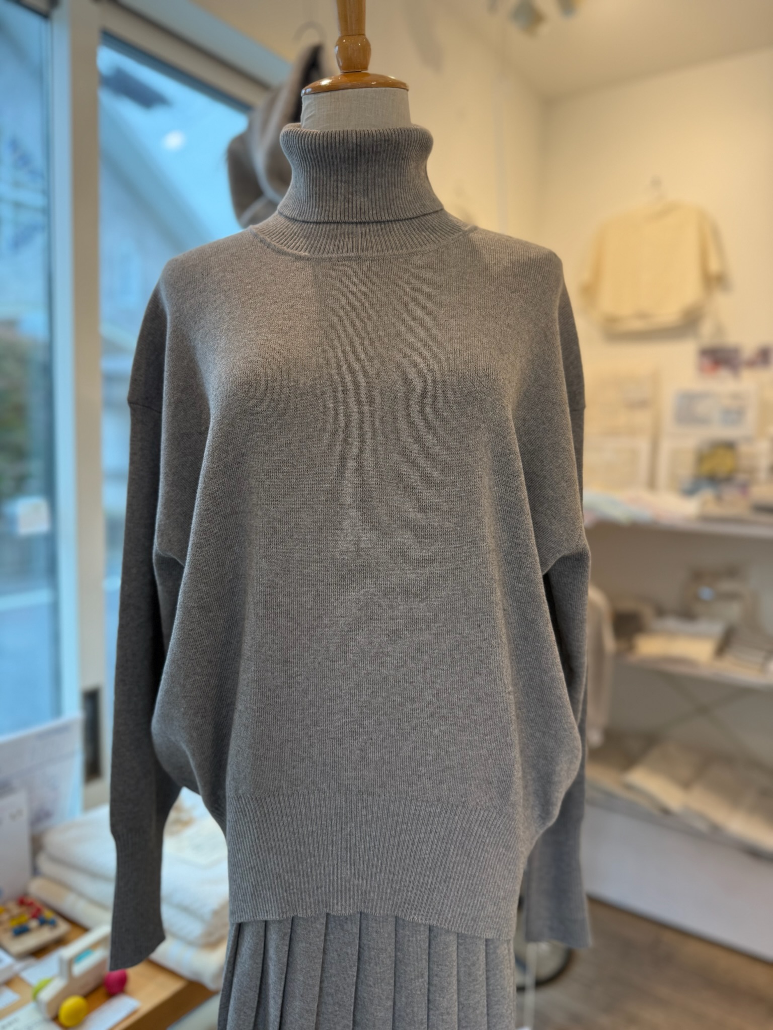 ゆったりと着られるタートルネックセーター。これまでのビッグタートルセーターのサイズ感はそのままに、総針編みにしたことで、フラットできれいに整った編地が実現しました。