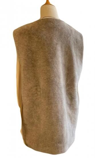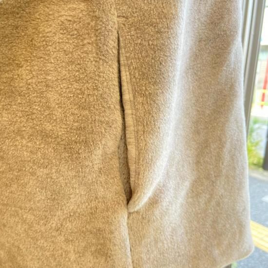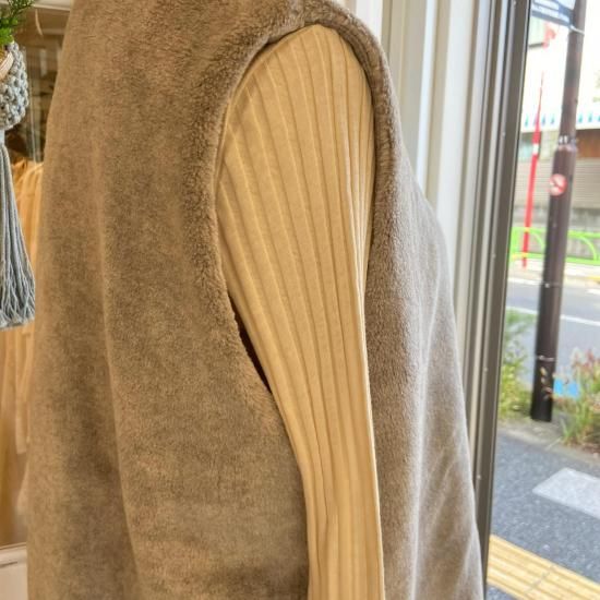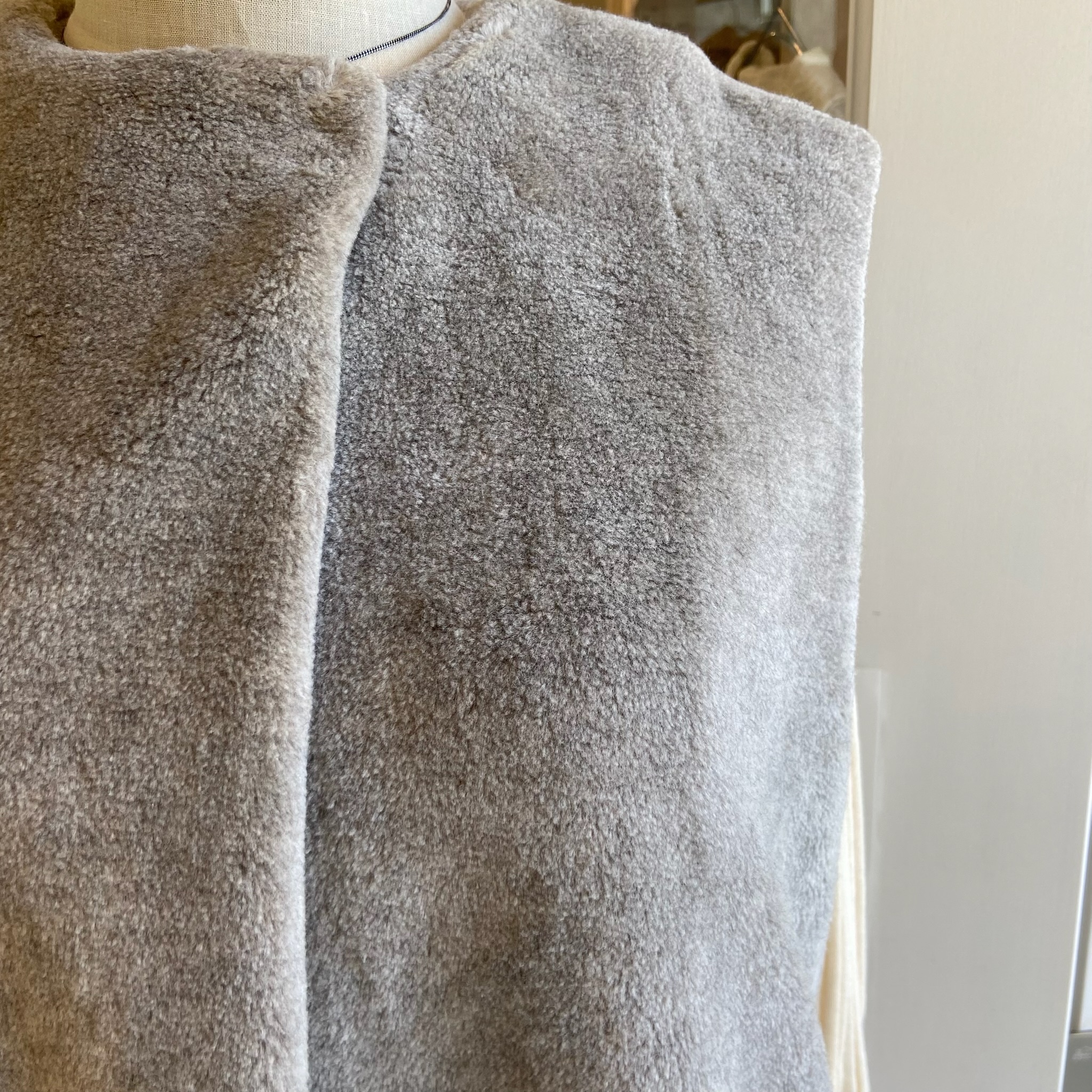 あたたかでやさしい肌触りのヤクフェイクファーの素材感が魅力的なノーカラーのジレ。フロントはホックで留まる、すっきり大人っぽいデザインです。おしりまですっぽりとあたたかいところも嬉しいポイント♪気温の低い季節には、コートのライナーとしてもおすすめの一着です。