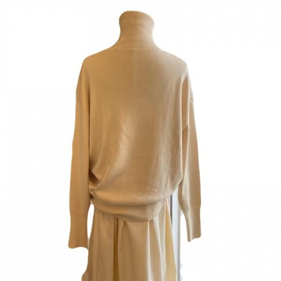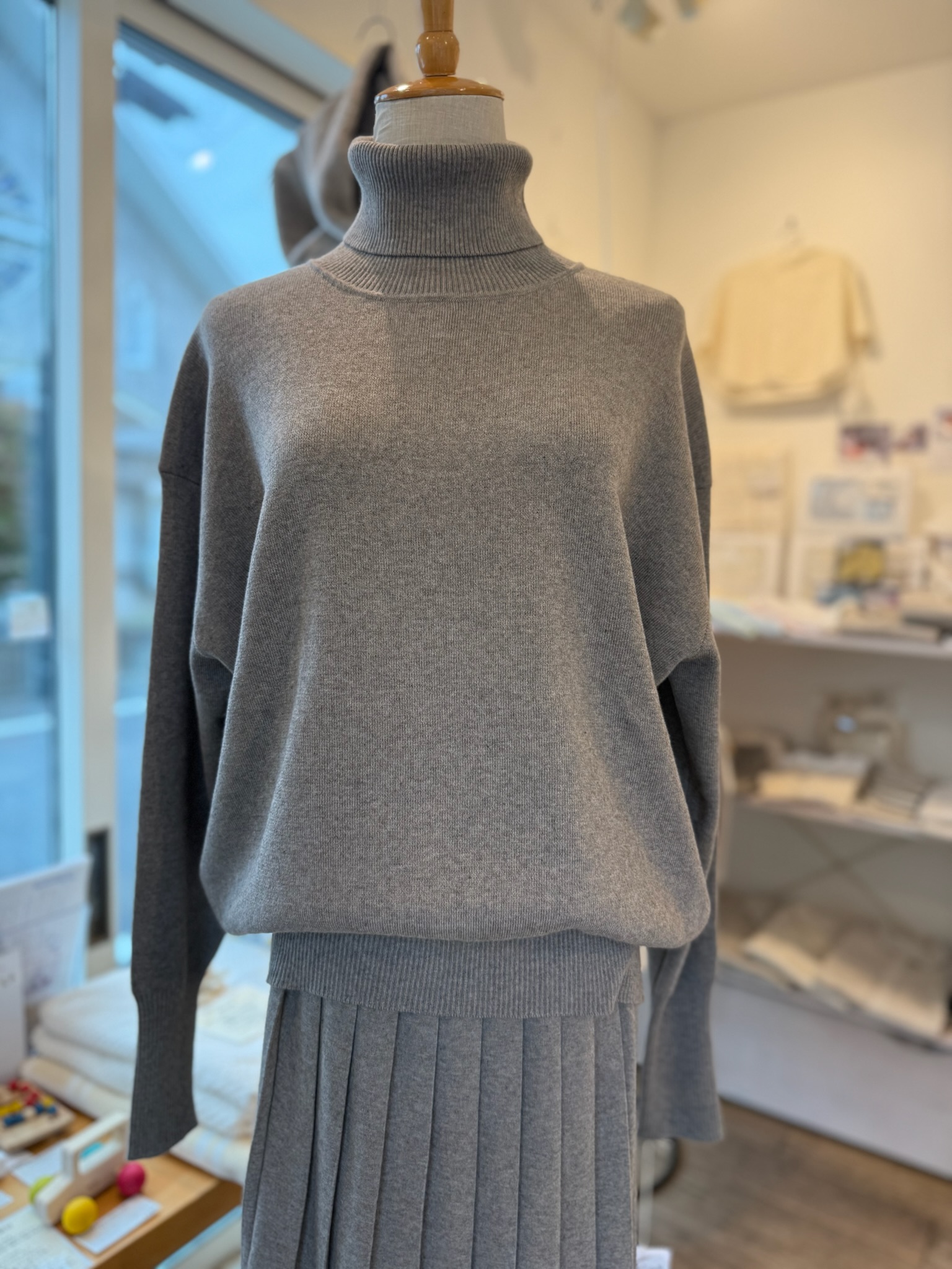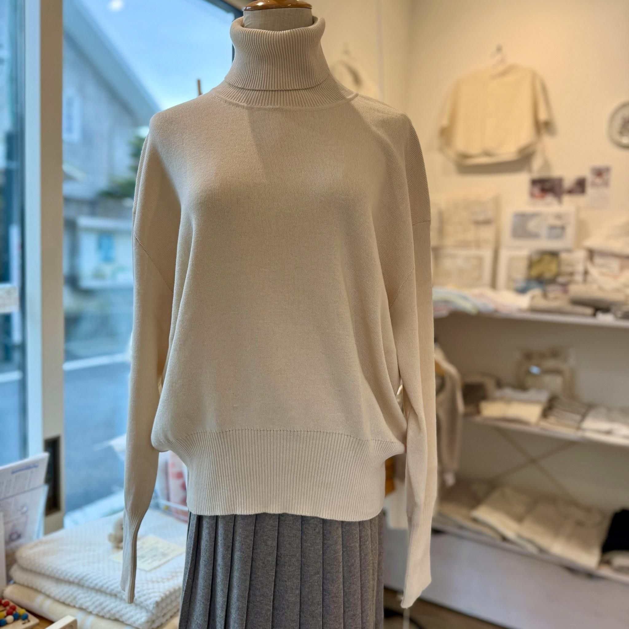ゆったりと着られるタートルネックセーター。これまでのビッグタートルセーターのサイズ感はそのままに、総針編みにしたことで、フラットできれいに整った編地が実現しました。