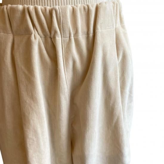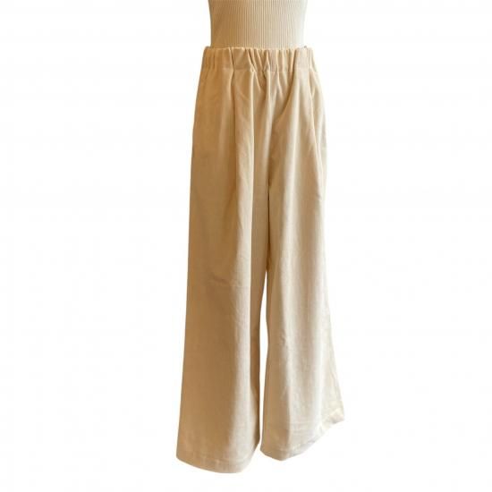 畝が目立たないコーデュロイの生地を使用した、フルレングスのワイドパンツ。カジュアルになりすぎないマットで優しい表情が魅力です。ウエストはゴム仕様にしているので着やすく、リラックス感のあるパンツです。